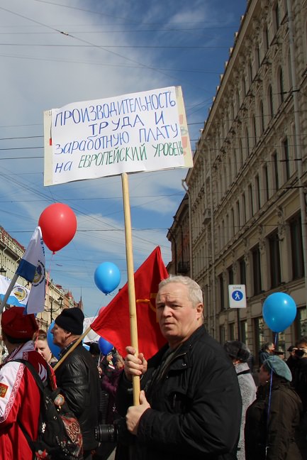 Тем не менее 35 территориальных организаций отраслевых профсоюзов вывели на Невский проспект своих членов - работников образования и здравоохранения, судостроения и машиностроения, сферы ЖКХ и торговли, металлургии, нефтегазовой, химической промышленности и многих других с лозунгами: «За Достойный труд!», «Человек труда – основа государства!», «Зарплате – реальный рост!», «Серая зарплата сегодня – черные дни завтра!», «Молодым – работу, пенсионерам – заботу!», «Работникам – достойные условия труда!», «Требуем МРОТ на уровне прожиточного минимума!», «Даешь МРОТ без стимулирующих и компенсационных выплат!», «Каждому предприятию – коллективный договор!», «Социальное партнерство – залог стабильности государства!» и другими. Многие лозунги и требования профсоюзов касались ситуации в конкретных отраслях: «Российский флот – под Российский флаг!»,«Достойную зарплату водителю автобуса Санкт-Петербурга!», «Молодым медикам - достойную заработную плату!» и другие.