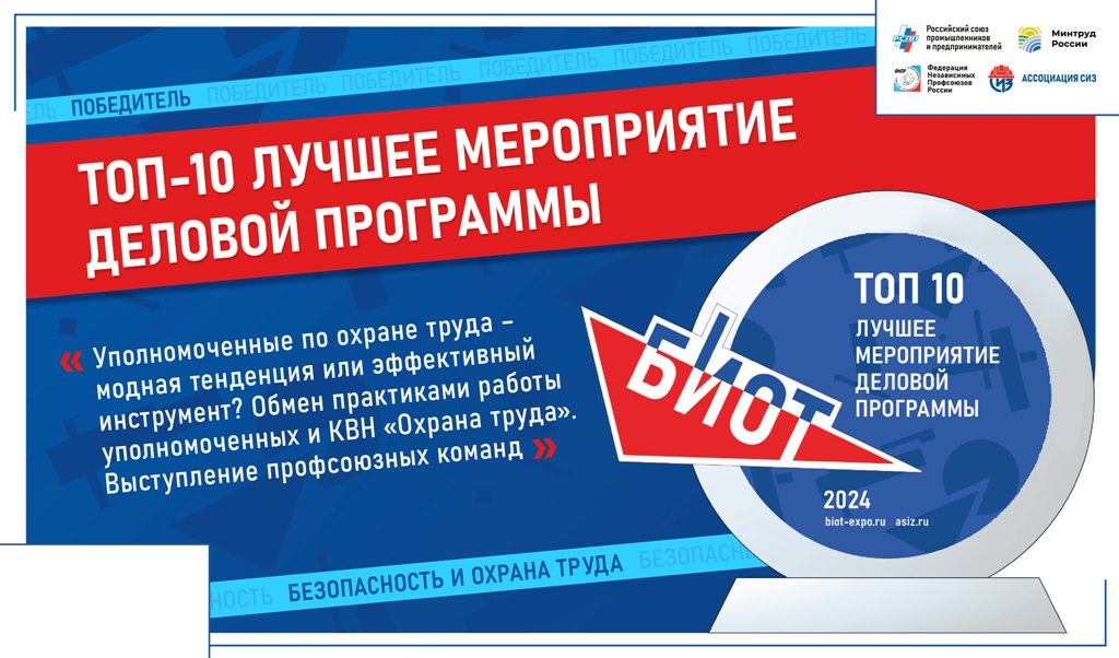 По итогам голосования среди участников и посетителей выставки «Безопасность и охрана труда—2024» определены лучшие новинки и экспозиции компаний, лучшие спикеры выставки, а также особо запомнившиеся мероприятия деловой программы. Лучшими мероприятиями выставки-форума, вошедшими в ТОП-10, стали Круглый стол ФНПР на тему: "Уполномоченные по охране труда – модная тенденция или эффективный инструмент в управлении профессиональными рисками?" и КВН "Охрана труда" с выступлением профсоюзных команд.