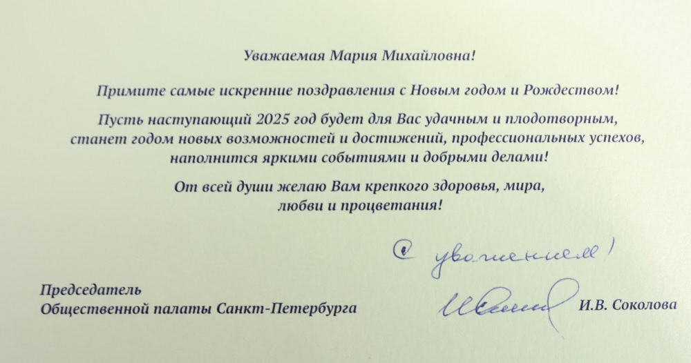 Профсоюзы города на Неве в лице исполняющего обязанности председателя Ленинградской федерации профсоюзов Марии Артюхиной поздравляет с Новым годом и Рождеством Христовым председатель Общественной палаты Северной столицы Ирина Соколова.