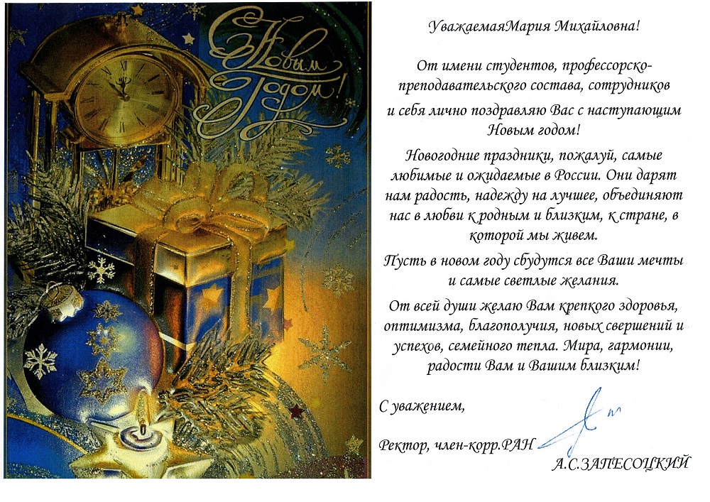В новогоднем поздравлении за подписью ректора Санкт-Петербургского гуманитарного университета профсоюзов Александра Запесоцкого, от имени студентов и профессорского-преподавательского состава СПбГУП, содержатся пожелания счастья, здоровья, оптимизма и новых свершений.