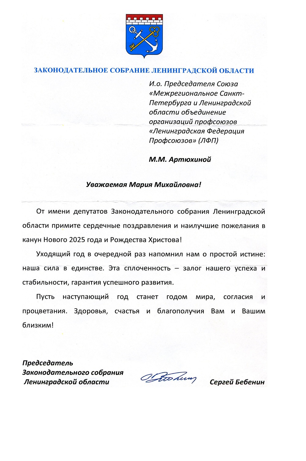 - Сплоченность - залог нашего успеха, - говорится в поздравлении с Новым годом и Рождеством Христовым, которое прислал профсоюзам региона председатель Законодательного собрания Ленинградской области Сергей Бебенин.
